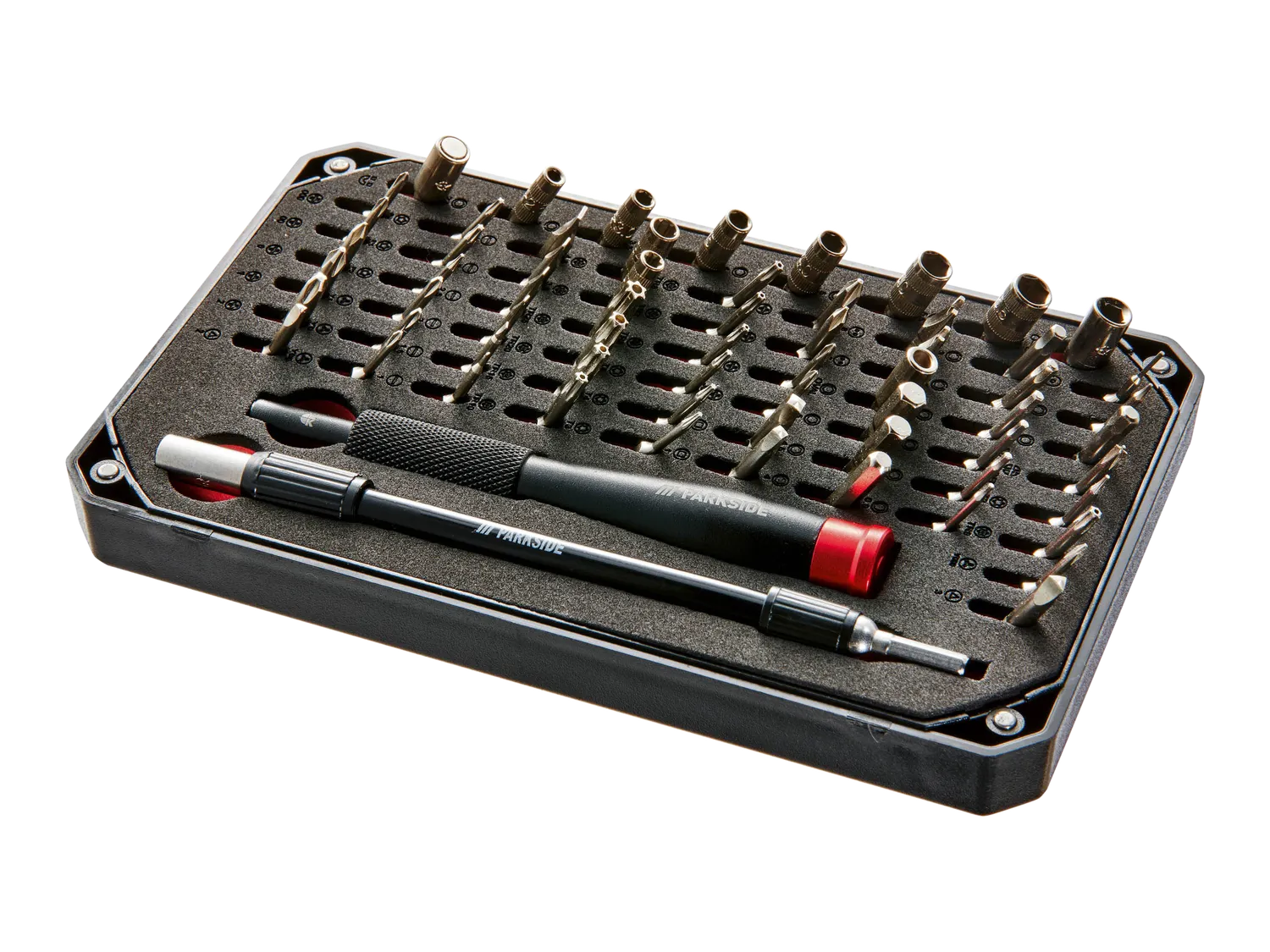 Comprend : 64 embouts de précision, un porte-embouts de précision avec aimant et une rallonge flexible